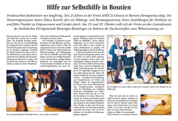 [:de]In den Gottesdiensten der katholischen Kirchgemeinde Binningen-Bottmingen im Rahmen der Eucharistiefeier zum Weltmissionstag stellt sich AMICA Schweiz am 19. und 20. Oktober vor.